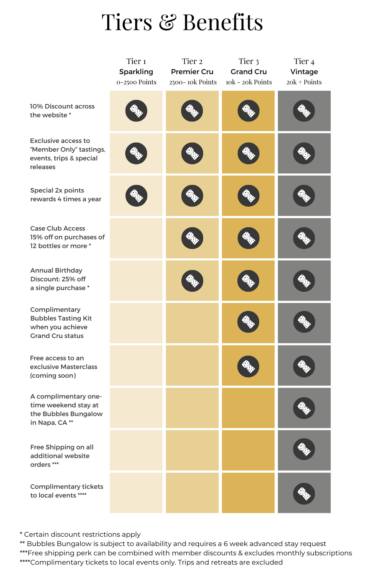 Welcome to the Cork Collective, the exclusive rewards program for our valued Bubbles Club Members, designed to elevate your champagne experience. As a valued club member, you're automatically eligible for this VIP Tier Program, where your purchases and engagement unlock exceptional rewards and privileges. Click the "★Rewards" icon below to login in or sign up with your Bubbles Club email address.